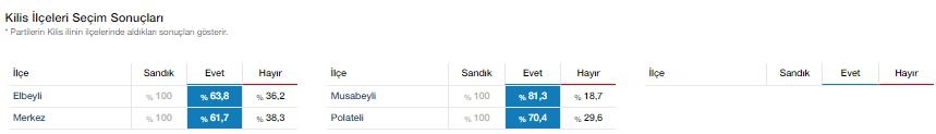 Tüm ilçelerinden evet çıkan Kilis'in ilçelerinde oy oranları şöyle: