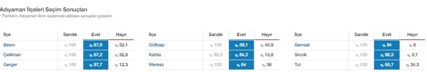 Tüm ilçelerinden evet çıkan Adıyaman'ın ilçelerinde oy oranları şöyle: