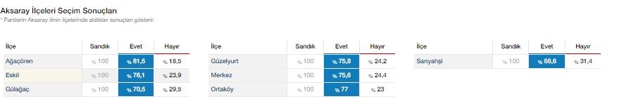 Tüm ilçelerinden evet çıkan Aksaray'ın ilçelerinde oy oranları şöyle: