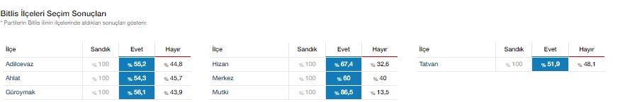 Tüm ilçelerinden evet çıkan Bitlis'in ilçelerinde oy oranları şöyle: