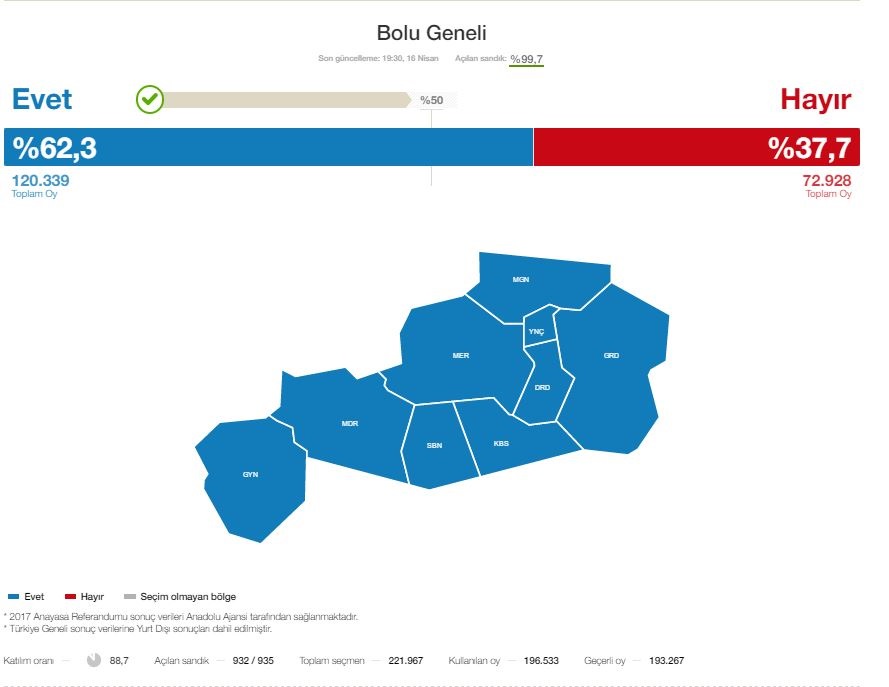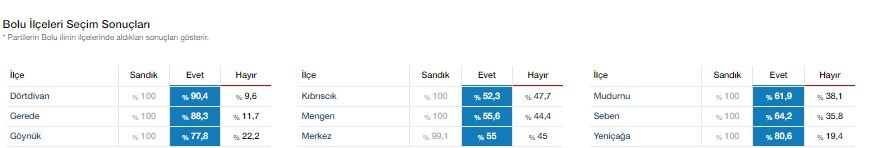Tüm ilçelerinden evet çıkan Bolu'nun ilçelerinde oy oranları şöyle: