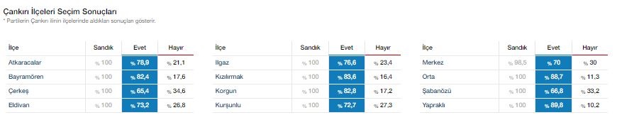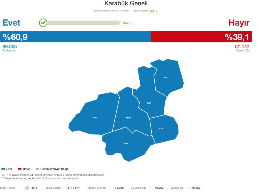 Tüm ilçelerinden evet çıkan Karabük'ün ilçelerinde oy oranları şöyle: