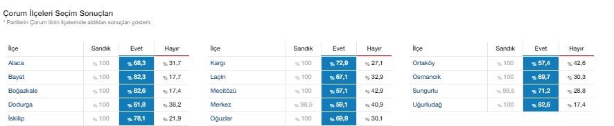 Çorum'un da tüm ilçelerinden 'Evet' çıktı.