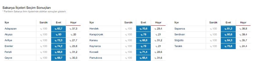Tüm ilçelerinden evet çıkan Sakarya'nın ilçelerinde oy oranları şöyle: