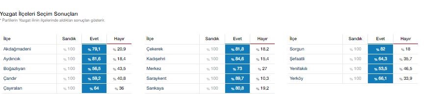 Tüm ilçelerinden evet çıkan Yozgat'ın ilçelerinde oy oranları şöyle: