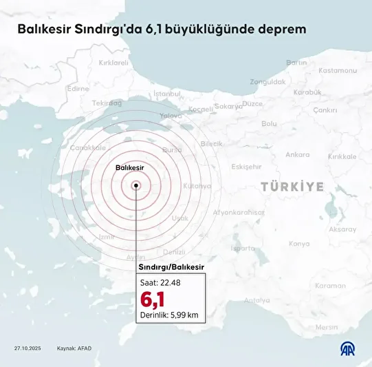 AFAD, resmi X hesabından 27 Ekim 2025 tarihli yaptığı paylaşımında saat 22.50'de merkez üssü Balıkesir'in Sındırgı ilçesinde 6.1 büyüklüğünde deprem meydana geldiğini duyurdu.