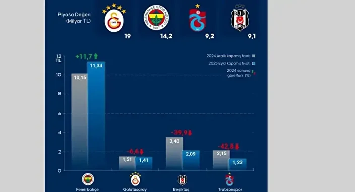 Spor şirketlerinin eylül ayındaki performanslarına bakıldığında yatırımcısına Galatasaray yüzde 15,1, Fenerbahçe yüzde 14,4, Beşiktaş yüzde 8,3 ve Trabzonspor yüzde 3,2 kaybettirdi. Halka açık 4 spor şirketi arasında en fazla piyasa değerine sahip kulüp olan Galatasaray eylül ayını 19 milyar 35 milyon lira piyasa değeriyle tamamladı.