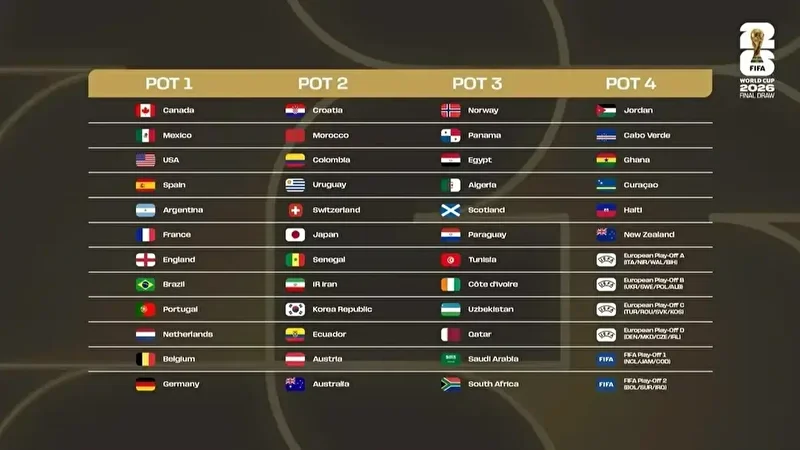 FIFA açıklamasında, kıtalararası play-offlardan iki takım ile Avrupa elemelerinden gelecek dört takımın 4. torbada toplanacağı belirtildi. Ev sahibi Kanada, Meksika ve ABD otomatik olarak 1. torbada yer alırken, kalan 39 takım ise ülke puanlarına göre dörder gruba ayrıldı.
