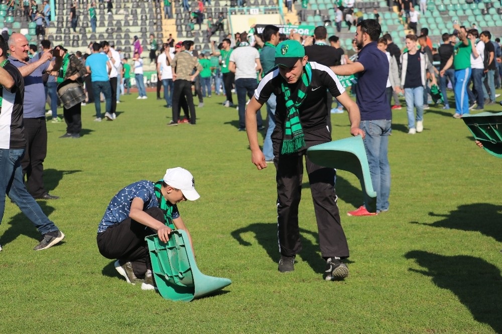 İsmetpaşa Stadı’nın koltuk ve çimlerini söken taraftarlar ilginç görüntüler verdi.
