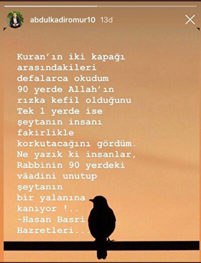- "Kur’ân’ın iki kapağı arasındakileri defalarca okudum. 90 yerde Allah'ın rızka kefil olduğunu, tek bir yerde ise şeytanın insanı fakirlikle korkutacağını gördüm. Ne yazık ki insanlar, Rabbinin 90 yerdeki vaadini unutup şeytanın bir yalanına kanıyor!"