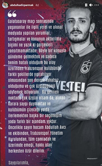 - "Böyle bir konuyla gündeme gelmekten ve sadece benim hatalı olduğum bu olay üzerinden Trabzonspor Kulübü'nün farklı şekillerde yıpratılıyor olmasından son derece rahatsız olduğumu ve çok üzüldüğümü söylemek istiyorum. Bu gelinen noktada çok üzgün olsam da alınan karara saygı duymaktan ve kulübümün çizeceği yolda ilerlemekten başka bir seçeneğim ya da farklı bir ajandam yoktur. Öncelikle sayın hocam Abdullah Avcı ve ekibinden, Trabzonspor Yönetim Kurulundan tüm camiadan ve üzerimde emeği, hakkı olan herkesten özür dilerim. Saygılarımla."