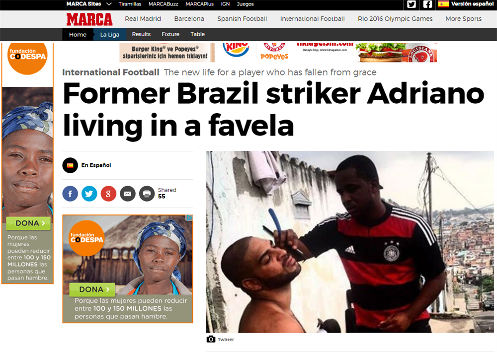 Marca gazetesinde yer alan habere göre; kariyerindeki parlak günlerin hayli uzağında yer alan Adriano artık favelalarda yaşıyor ve söz konusu bölgedeki çetelerle çalışıyor. Geçmişinde iki Serie A şampiyonluğu bulunan Brezilyalı futbolcunun sosyal medyaya düşen son fotoğrafları görenleri fazlasıyla şaşırttı.
