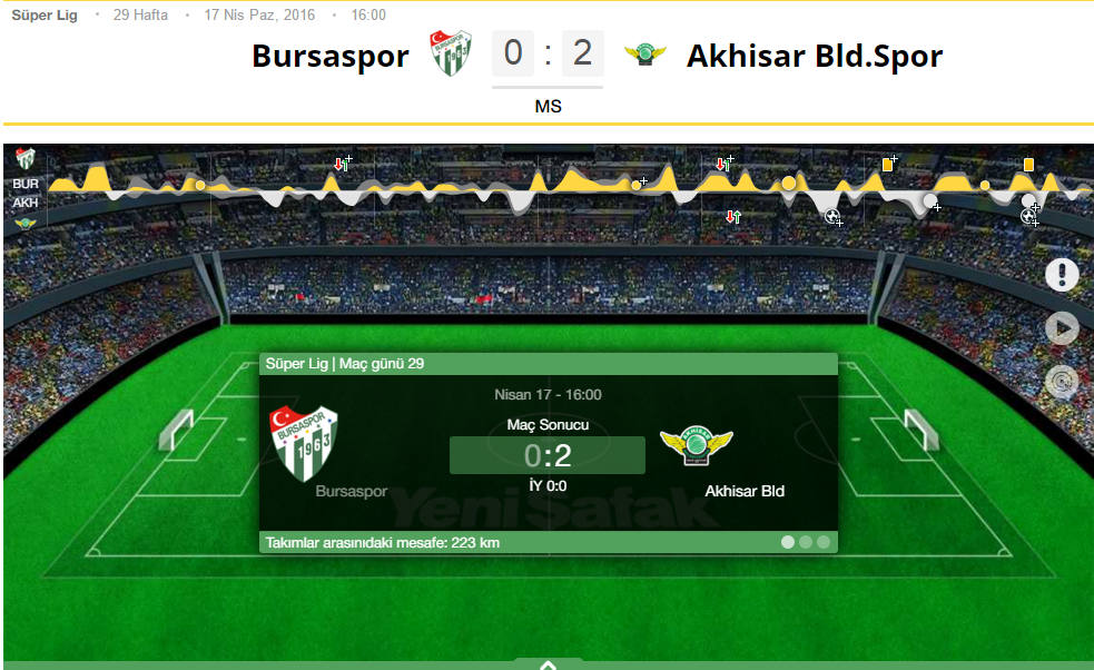 Akhisar Belediyespor, Bursaspor'u 2-0 mağlup etti. Ege temsilcisi bu sonuçla birlikte puanını 43'e çıkarttı ve 6.sıraya yükseldi. Bursaspor ise 38 puanla 9.sırada yer aldı.