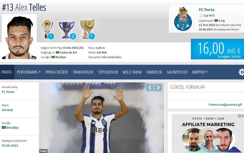 Porto'nun 2 sezon önce Galatasaray'dan 6.5 milyon euro bedelle transfer ettiği Alex Telles, kariyerinin zirve performansını sergiliyor. Bu sezon takımıyla çıktığı 40 resmi maçta 3 gol atıp 18 asist yapan başarılı sol bek Brezilya Milli Takımı Teknik Direktörü Tite'nin de radarında bulunuyor.