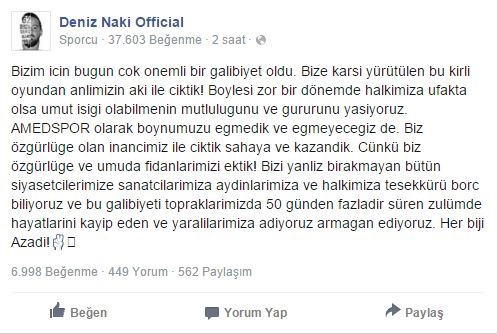 Ziraat Türkiye Kupası mücadelesinde Bursaspor'u deplasmanda 2-1 yenerek çeyrek finale yükselen Amedspor'un oyuncularından Deniz Naki, sosyal medya aracılığıyla bir açıklama yaptı.