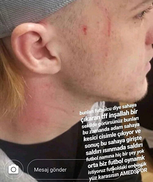 Amedsporlu futbolcunun sahaya kesici aletle çıktığını ifade eden Erişçi, takım arkadaşlarının vücudundaki yaraları gösteren fotoğrafları, "Bunları futbolcu diye sahaya çıkaran TFF, bunları umarım görürsünüz. Adam sahaya kesici cisimle çıkıyor. Futbolun en büyük yüz karasısın Amedspor" ifadeleriyle paylaştı.