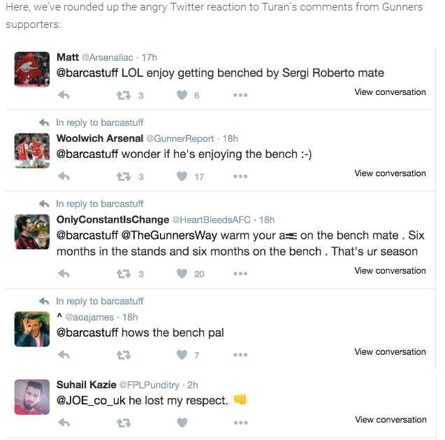 Milli yıldızın yaptığı 'Arsenal'e gitmek için iyi oynamak yeterli ama Barcelona'ya gidebilmeniz için çok çok iyi oynamalısınız' açıklamasına Arsenal taraftarından tepki yağdı.