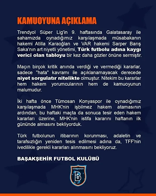 Süper Lig 9. haftasında Galatasaray'ı konuk eden Başakşehir FK, son haftalarda kendileri aleyhinde hakem kararları verildiği iddiasıyla açıklama yaptı.