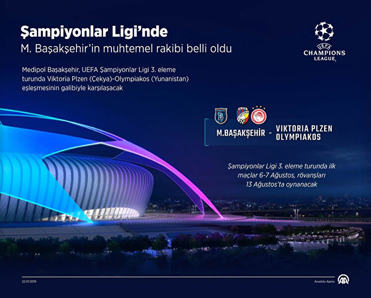 Medipol Başakşehir’in, UEFA Şampiyonlar Ligi 3. Eleme Turu’ndaki rakibi Viktoria Plzen-Olympiakos eşleşmesinin galibi olacak.