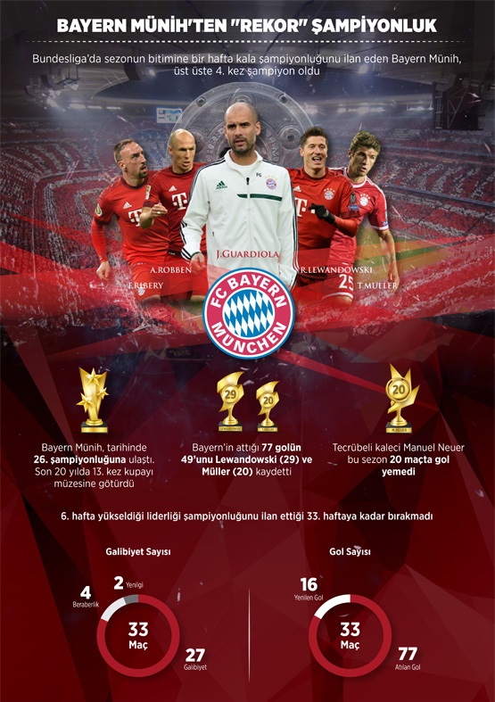 Son yıllarda kurduğu güçlü kadrosuyla 2012-2013 sezonundan bu yana şampiyonluğu kimseye kaptırmayan Bavyera ekibi, bu sezon da zirveyi sezonun bitimine bir hafta kala garantileyerek üst üste 4. kez mutlu sona ulaştı ve Bundesliga'da bu başarıyı yakalayan ilk takım olarak tarihe geçti.