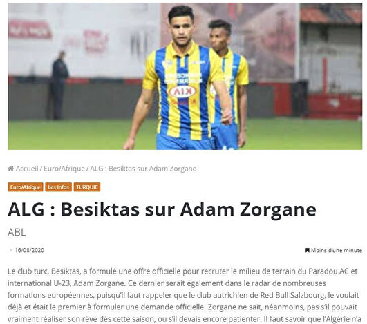 Footafrique'nın haberine göre Beşiktaş, genç orta saha için resmi teklifte bulundu. Fakat Adem Zorgane'yi sadece Beşiktaş değil Red Bull Salzburg başta olmak üzere Avrupa'nın birçok ekibi yakından takip ediyor. Hatta Salzburg'da Zorgane için resmi teklif yapan kulüpler arasında yer alıyor. Haberde ayrıca Cezayir kulübünün ve genç oyuncunun henüz bir karar vermediği kaydedildi.
