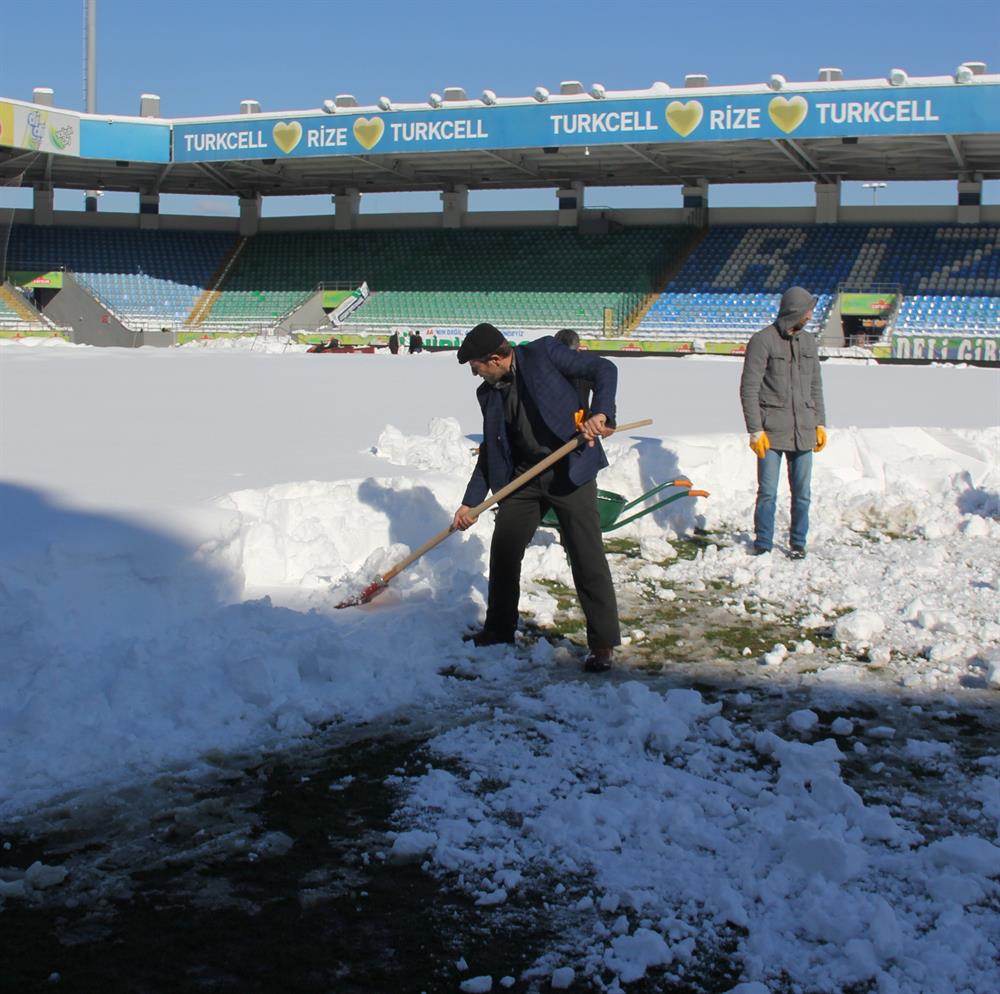 Çaykur Rizespor ile Mersin İdmanyurdu Ziraat Türkiye Kupası D Grubu son maçında yarın saat 17.00'de karşı karşıya gelecek. Mücadele öncesi üç gün etkili olan yoğun kar yağışı sonucu Çaykur Didi Stadyumu'nda 1 metre kalınlığında kar kütlesi oluştu. Sahanın maç saatine hazır hale getirilebilmesi için çalışmalara bir gün öncesinden başlandı. Zeminin zarar görmemesi için kar temizleme çalışmaları küreklerle ve el arabaları ile yavaş bir şekilde gerçekleştiriliyor.