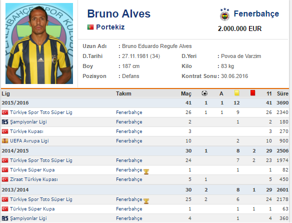 Bruno Alves sözleşme gereği Fenerbahçe'den 1.2 milyon Euro garanti ücret alacak. Alves eğer 20 resmi maçın üzerinde oynarsa 500 Bin Euro daha alacak.
