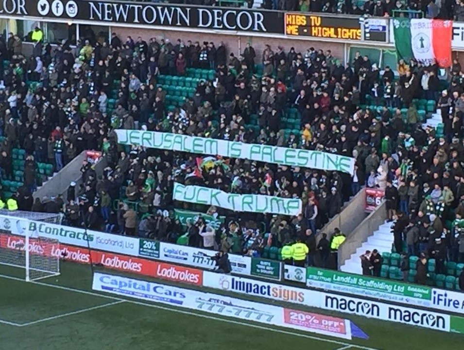 - Celtic taraftarı, 10 Aralık 2017'de oynanan Hibernian maçı öncesinde de ABD Başkanı Donald Trump'ın "İsrail'in başkenti Kudüs'tür" söylemini açtıkları pankartlarla protesto etmiş ve "Kudüs Filistin'indir" sloganları atmıştı.