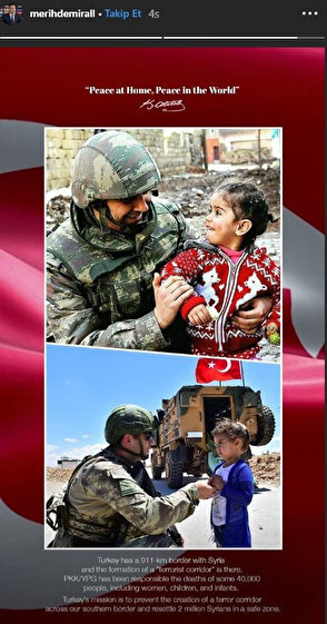 Diğer milli yıldızımız Merih Demiral ise Juventus'un eski futbolcusu Marchisio'nun Barış Pınarı Harekatı'na gösterdiği tepkiye yönelik bir paylaşımda bulunmuştu. "Yurtta sulh, cihanda sulh" sözüyle harekatın sebeplerini anlatan Merih, "Türkiye ile Suriye sınırında terörist koridor oluşumu var. PKK/YPG kadınlar, çocuklar ve bebekler dahil 40 bin kişinin ölümünden sorumludur. Türkiye'nin misyonu, güney sınırımızda terör koridoru yaratılmasını engellemek ve 2 milyon Suriyeli'yi güvenli bölgeye yerleştirmek" ifadelerini kullandı.
