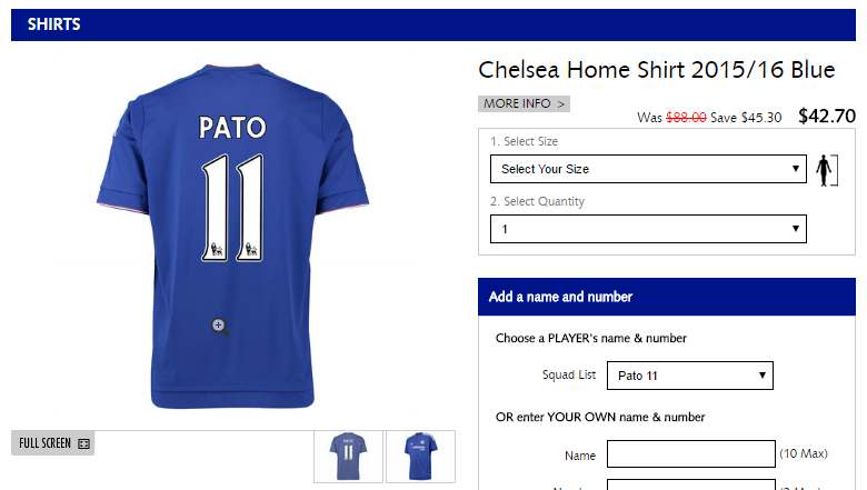 Normalde mavi klasik bir Chelsea forması 65 sterlin'e satılırken 'Pato' yazılı yeni sezon formaları 32 sterline düşürüldü.