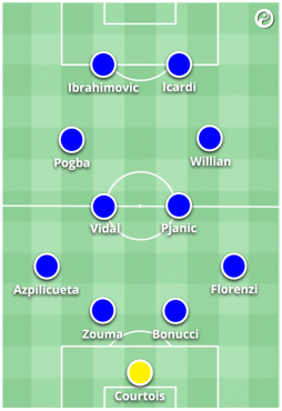 Rüya Kadro'nun ileri ucunda İbrahimovic ve Icardi görev alırken; orta alan Pogba, Willian, Vidal ve Pjanic dörtlüsünden oluştu. Savunma hattında Azpilicueta, Zouma, Bonucci ve Florenzi'nin bulunduğu takımın kalesini ise Courtois koruyor.