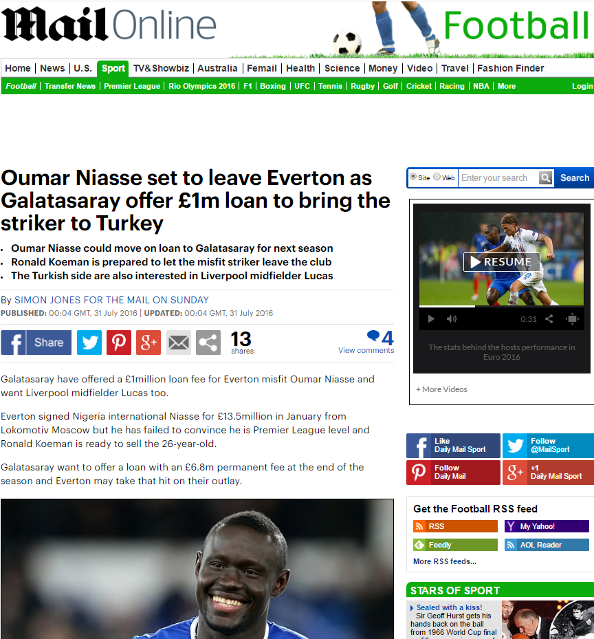Galatasaray Lucas Leiva'nın transferini resmiyete dökmeye hazırlanırken İngiliz basını sarı kırmızılılarla ilgili bir flaş haberi daha okuyucularına aktardı. Everton'da beklentileri karşılayamayan Oumar Niasse'ın takımdan ayrılma hazırlığı yaptığı ifade edilirken Galatasaray'ın 26 yaşındaki futbolcuyu kiralayacağı belirtildi.