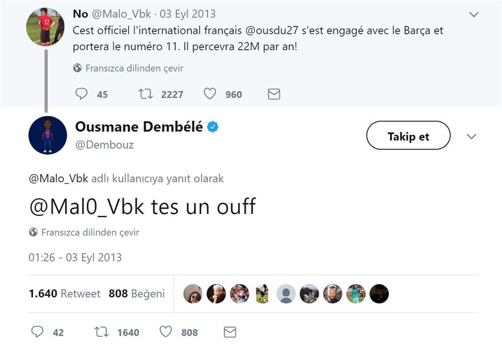 Barcelona'ya yaklaşık 130 milyon euro bonservis bedeli karşılığında transfer olan Ousmane Dembele'nin, Rennes alt yapısından takım arkadaşı olan Malo Verbeke'nin 2013 yılında kendisine yazdığı, "Barcelona'ya transfer oldun" tweetine "Sen delisin" şeklinde yanıt verdiği ortaya çıktı.