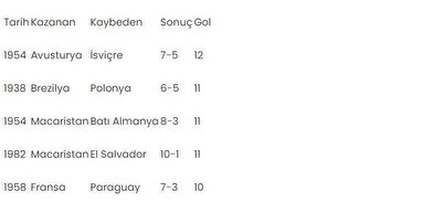 Dünya Kupası'nın en gollü maçı, 1954'te İsviçre'de düzenlenen turnuvada oynandı. Avusturya, ev sahibi İsviçre'yi 7-5 mağlup ederken sporseverler bu karşılaşmada 12 gol gördü. 1938'de Brezilya-Polonya, 1954'te Macaristan-Batı Almanya ve 1982'de Macaristan-El Salvador karşılaşmaları da 11'er gole sahne oldu.