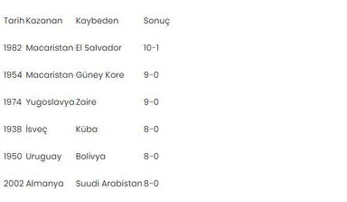 2022 Katar Dünya Kupası başlamadan önce, turnuvayla ilgili birçok merak edilen konu var. Bunlardan birisi de Dünya Kupası tarihinin en farklı galibiyetini kimin aldığı? Detayları haberimizde bulabilirsiniz.