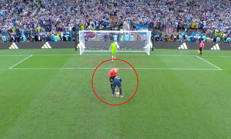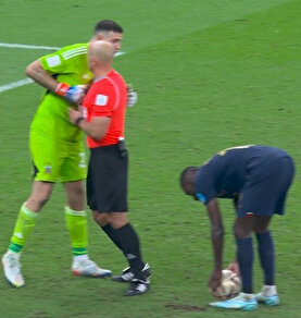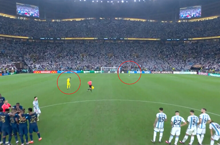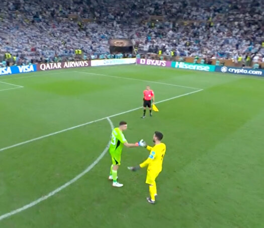 Martinez, Arjantin'in penaltısından sonra topu eline alıyor. Taraftarına dönüyor ve onları ateşliyor. Topu Tchouameni'ye değil yan tarafa atıyor.