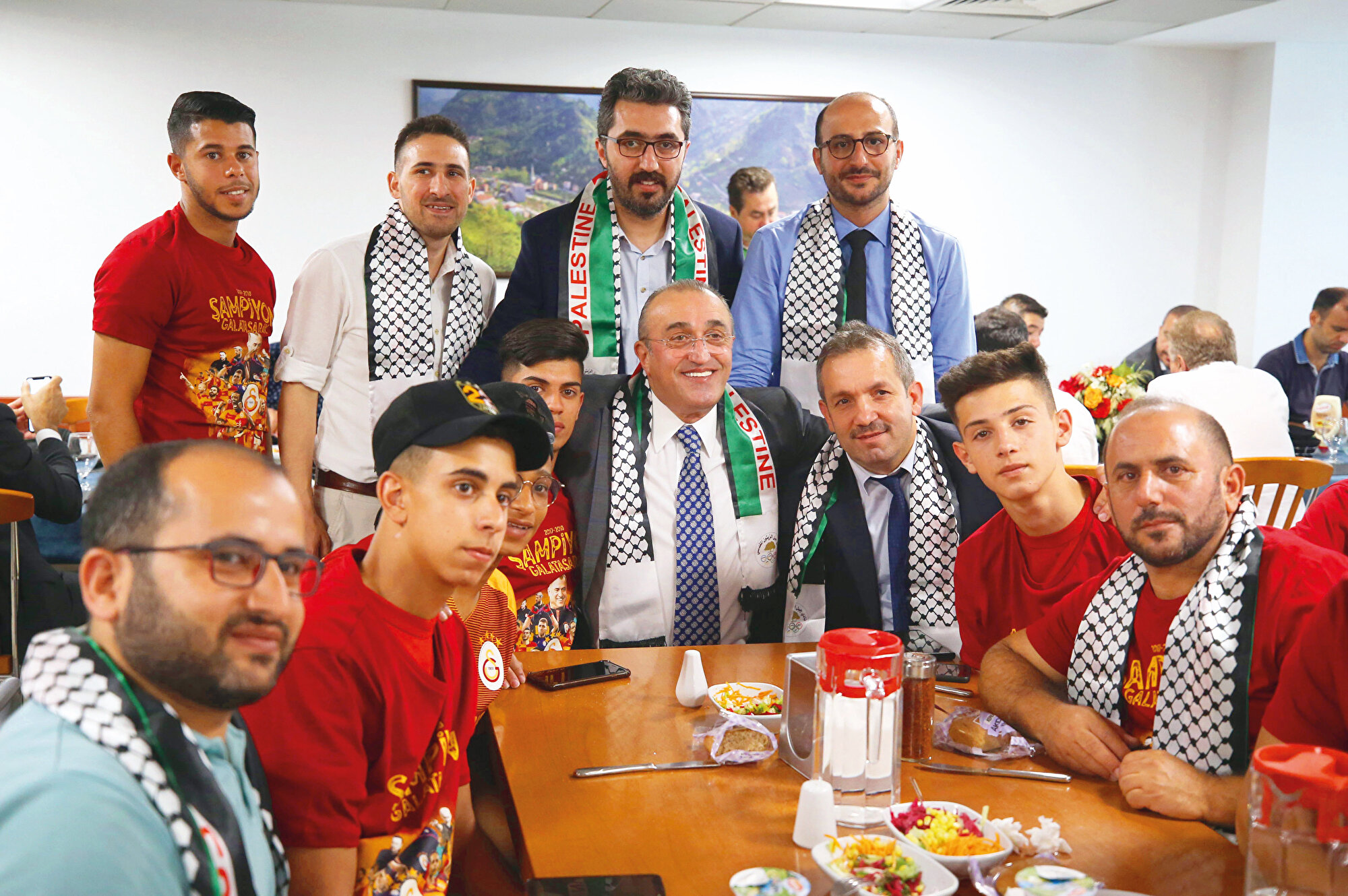 - Galatasaray İkinci Başkanı Abdurrahim Albayrak, Vefa İlim Yayma Mezunlar Derneği, Sakarya Üniversitesi ve İlim Yayma Vakfı’nın himayesinde Türkiye’de bulunan Filistin’nin Zeytindağı ve Beyt Hanina takımı oyuncularıyla yemekte bir araya geldi. Albayrak, Yenibosna’daki ofisinde düzenlenen yemekte basın mensuplarının sorularını yanıtlarken, “Filistin’den, Kudüs’ten gelen kardeşlerimiz misafirimizdi. Geçen sene de o mutluluğu yaşamıştık, bugün de yaşıyoruz. Onları mutlu edebilirsek ne mutlu bize” dedi. İlim Yayma Vakfının misafiri olarak Filistinlilerin geldiğini anlatan Albayrak, “Bir haftadır Sakarya Üniversitesi’nde idmanlarını ve maçlarını yaptılar. İnşallah önümüzdeki yıllarda Galatasaray ile de maç yaparlar. Kardeşlerimizi cumartesi günü oynayacağımız hazırlık maçında en iyi yerde ağırlamak istiyoruz. Ülkemize hoş geldiler. İnşallah biz de onların maçlarına gideriz, destek oluruz. Onları çok seviyoruz, dünyanın onları sevmesini diliyoruz” ifadelerini kullandı. Oyuncuların Türk Telekom Stadı’nı da gezdiğini vurgulayan Albayrak, “Dün akşam hepimiz yemekte Bilal Erdoğan ile beraberdik. Oyuncuları stadımızda misafir ettik. Allah’ın izniyle hepsi Galatasaraylı” dedi.