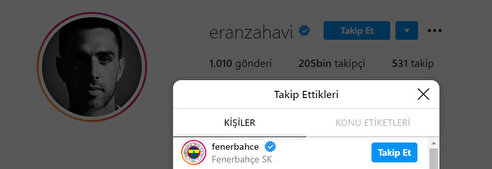 - Adı Fenerbahçe ile anılan Eran Zahavi, sosyal medya hesabından sarı-lacivertli takımı takibe aldı. 33 yaşındaki golcü oyuncunun bu hareketi, sarı-lacivertli taraftarları heyecanlandırırken, oyuncunun Fenerbahçe ile görüştüğü şeklinde yorumlandı.