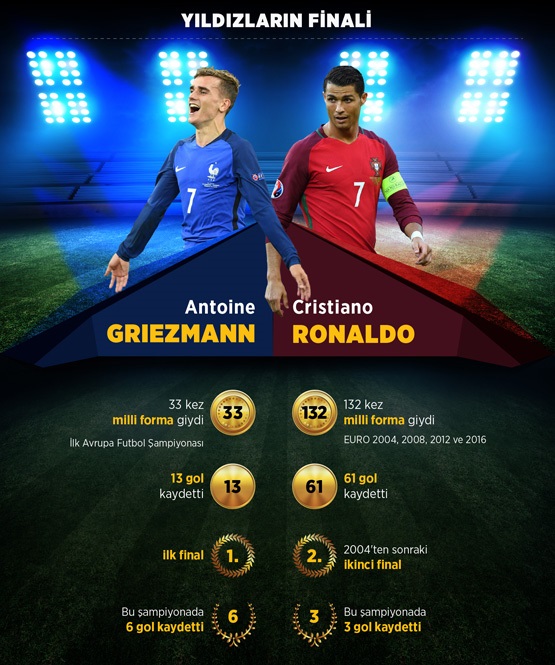 Turnuva boyunca takımına 3 gol, 3 asistlik katkı sunan Ronaldo, organizasyon tarihinde ikinci kez final oynayacak Portekiz'in ilk şampiyonluğunu kazanmasına yardım etmeye çalışacak. Şampiyonada 6 gol, 2 asistlik performans sergileyen Griezmann ise Fransa'nın EURO 1984 ve EURO 2000'den sonra üçüncü kez kupayı müzesine götürmesi için ter dökecek.