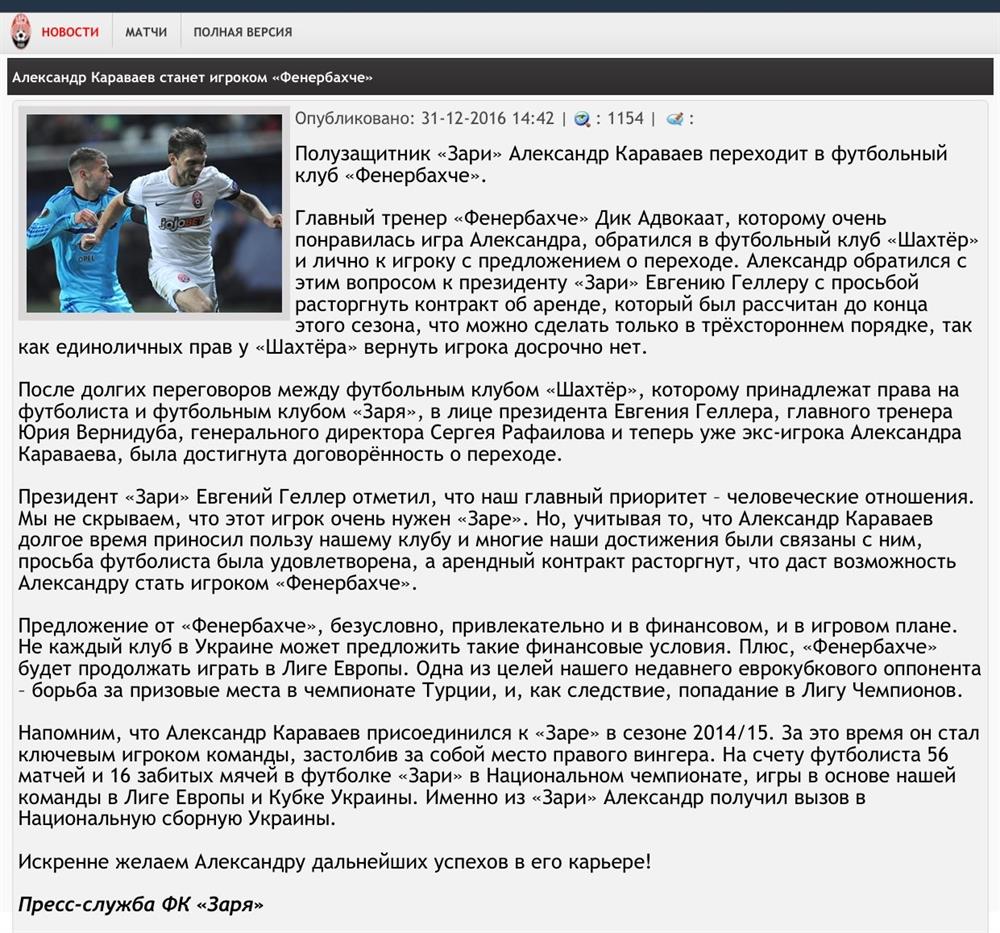Fenerbahçe, devre arası transfer dönemine Zorya Luhansk'ta oynayan orta saha oyuncusu Alexander Karavaev'i transfer etti.