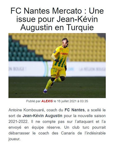 24 yaşındaki oyuncu Nantes'ın gelecek sezonki kadro planlamasında yer almıyor. Augustin'i elden çıkarmak isteyen Fransızlar, gelecek teklifleri bekliyor. Fransız basınında yer alan haberlere göre Fenerbahçe, Jean-Kevin Augustin'i kadrosuna katmak istiyor. Genç oyuncu için çalışmalarını yürüten sarı-lacivertlilerin, mutlu sona ulaşabileceği iddia edildi.