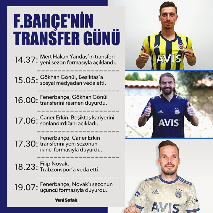 Transfer çalışmalarına devam eden Fenerbahçe bir gün içerisinde tam dört ismi kadrosuna kattığını açıkladı. Sarı-lacivertliler Sivasspor ile sözleşmesi sona eren Mert Hakan Yandaş, Beşiktaş ile sözleşme yenilemeyen oyuncular Gökhan Gönül ve Caner Erkin ile Trabzonspor'un maaş konusunda anlaşamadığı Filip Novak'ı transfer etti.