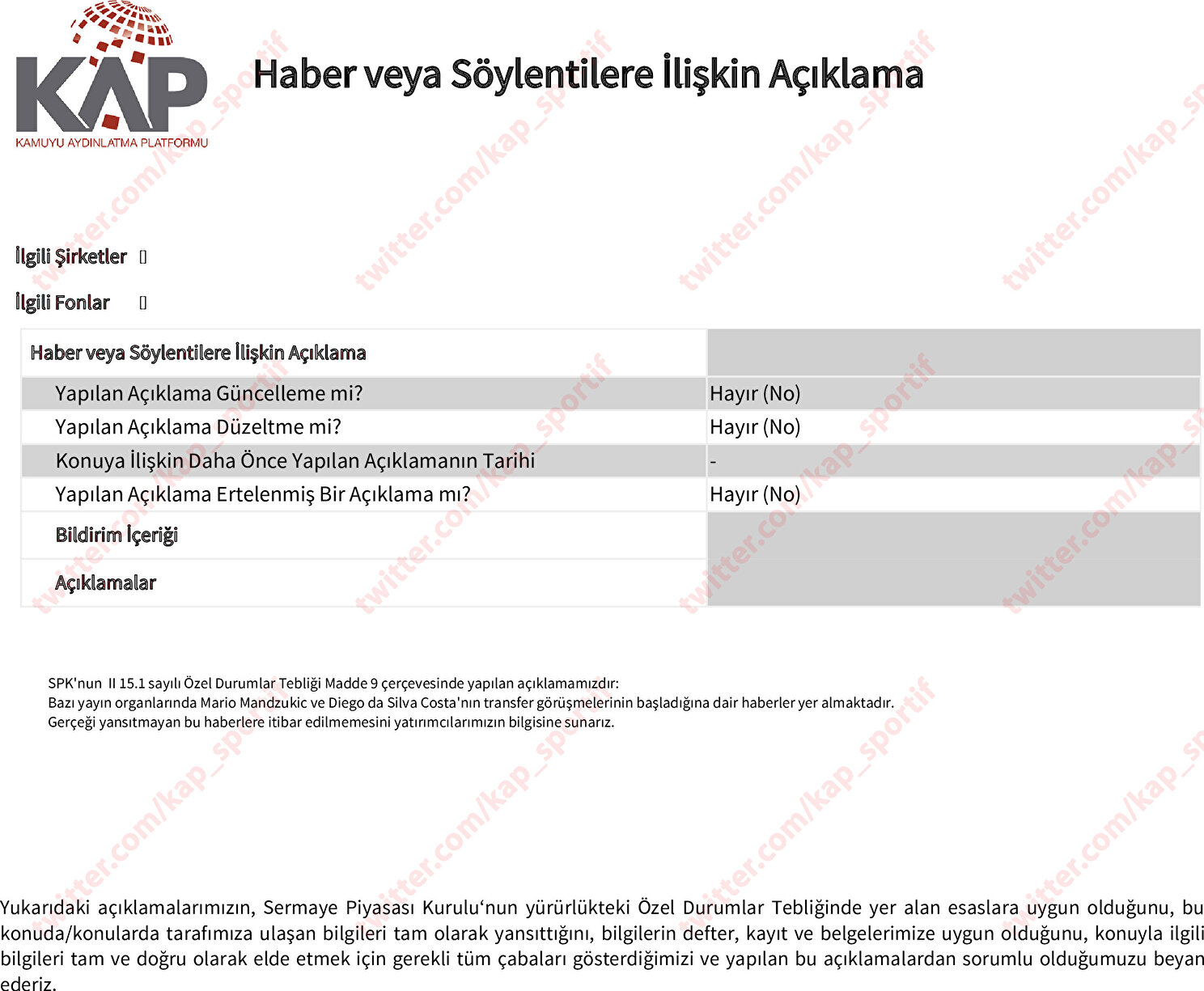 - "SPK'nun II 15.1 sayılı Özel Durumlar Tebliği Madde 9 çerçevesinde yapılan açıklamamızdır: Bazı yayın organlarında Mario Mandzukic ve Diego da Silva Costa'nın transfer görüşmelerinin başladığına dair haberler yer almaktadır. Gerçeği yansıtmayan bu haberlere itibar edilmemesini yatırımcılarımızın bilgisine sunarız. "