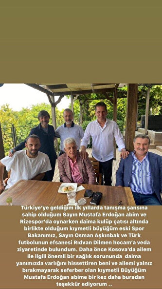 - Vedat Muriqi sosyal medya hesabından yaptığı açıklamayla veda etti. Muriqi paylaştığı fotoğrafa, "Türkiye'ye geldiğim ilk yıllarda tanışma şansına sahip olduğum Sayın Mustafa Erdoğan abim ve Rizespor'da oynarken daima kulüp çatısı altında birlikte olduğum kıymetli büyüğüm eski Spor Bakanımız, Sayın Osman Aşkınbak ve Türk futbolunun efsanesi Rıdvan Dilmen hocam'a veda ziyaretinde bulundum. Daha önce Kosova'da ailem ile ilgili önemli bir sağlık sorununda daima yanımızda varlığını hissettiren beni ve ailemi yalnız bırakmayarak seferber olan kıymetli Büyüğüm Mustafa Erdoğan abime bir kez daha buradan teşekkür ediyorum" notunu düştü.