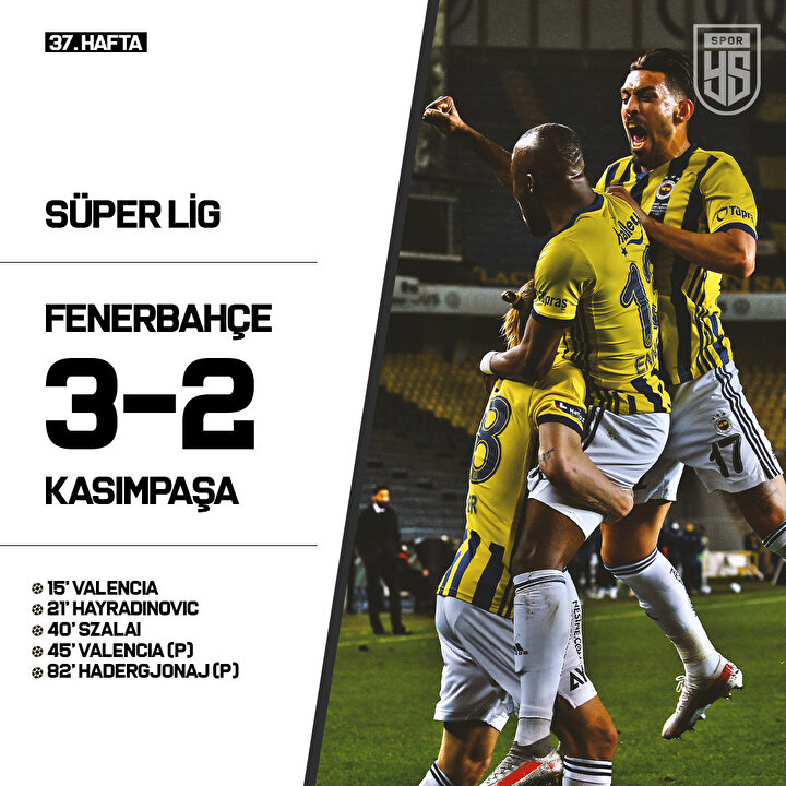 Süper Lig'de 37. haftanın kapanışında Fenerbahçe kendi sahasında Kasımpaşa'yı 3-2 mağlup ederek puanını 72'ye yükseltti. Sarı lacivertlilerin gollerini Valencia (2) ve Szalai atarken, konuk takımın golleri Hajradinovic ve Hadergjonaj'dan geldi.