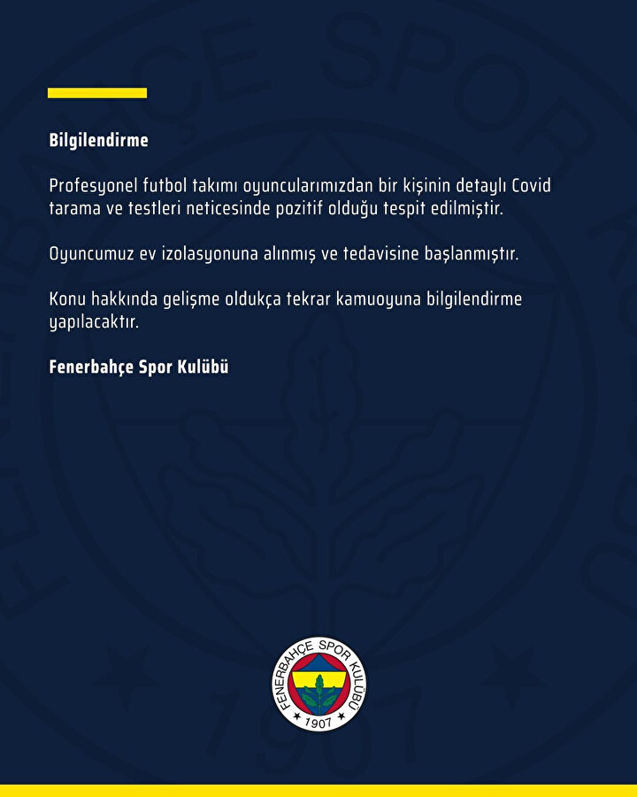 Sarı-lacivertli kulüpten yapılan açıklamada, "Profesyonel Futbol Takımı oyuncularımızdan bir kişinin detaylı Kovid tarama ve testleri neticesinde pozitif olduğu tespit edilmiştir" denildi.