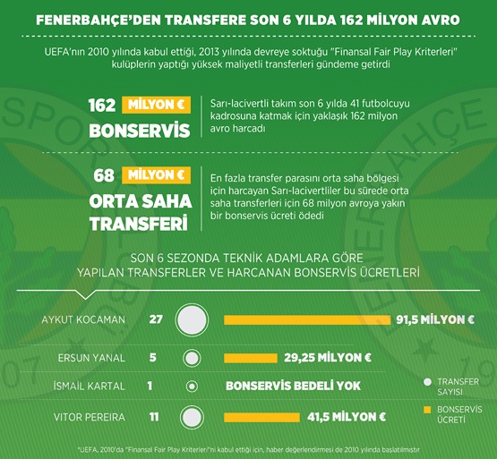 Fenerbahçe, 2010 yılından bu yana 41 transfer yaptı ve kasasından 162 milyon avroya yakın bir bonservis ücreti çıkardı. Bu 41 oyuncudan Joseph Yobo, Reto Ziegler, Lazar Markovic, Abdoulaye Ba ve Fabiano Ribeiro'yu kiralık olarak alan Fenerbahçe, sadece 6 futbolcu için bonservis ödemedi. Sarı-lacivertliler, daha sonra Yobo'nun da dahil olduğu 31 oyuncuyu ise bonservisleriyle kadrosuna kattı.