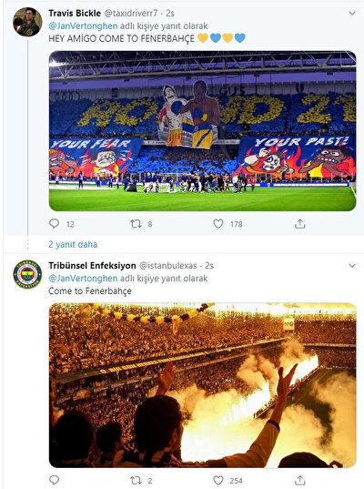 - Jan Vertonghen'in sosyal medyadan yaptığı açıklama üzerine, Fenerbahçeli taraftarlar yüzlerce yorumda bulundu. Sarı-lacivertli taraftarlar "Come to Fenerbahçe" çağrısıyla başarılı stoperi Fenerbahçe'ye davet ettiler. Taraftarların bu mesajları kısa süre içerisinde Twitter gündemine girerken, Vertonghen cephesinden bir açıklama gelmedi.