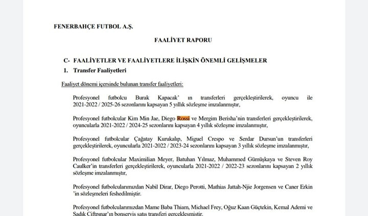 Fenerbahçe Kulübü'nün yayınladığı faaliyet raporuna göre, MLS'ten kiralanan Diego Rossi'nin bonservisinin alındığı ve 4 yıllık sözleşme imzalandığı iddia edildi.