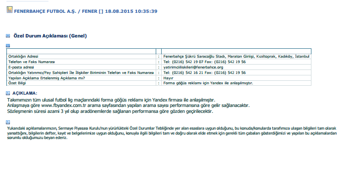 Fenerbahçe Futbol takımının formalarında göğüs reklamı olarak yer alan Yandex, sarı lacivertli kulüp ile anlaşmasını devam ettirmek istiyor. Ancak Fenerbahçe'nin bu firmaya sıcak bakmaması anlaşmayı da zora sokuyor.
